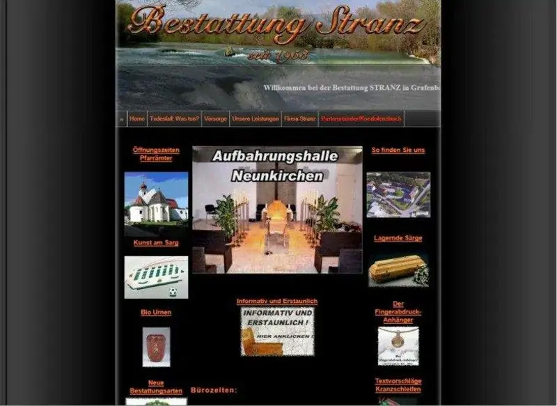 Seit dem Jahr 2008 wurde das Bestattungsunternehmen Stranz umstrukturiert und in viele wichtige Bereiche investiert, wie auf folgenden Bildern zu erkennen ist. Seit 5 Jahren unterstützen wir unsere Öffentlichkeitsarbeit durch die Nutzung des Mediums Internet. 227.824 Zugriffe auf unsere Homepage zeigen, dass dieses Angebot sehr gut angenommen wurde.